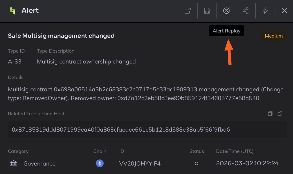 1. Go to Risk Insights > Alerts in Hypernative (alternatively you can replay alerts from a Watchlist > Alerts as well)