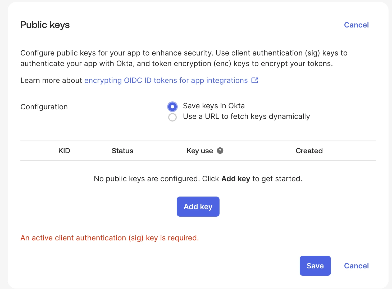 - In Okta, click Add key and paste the JSON from Clarion.