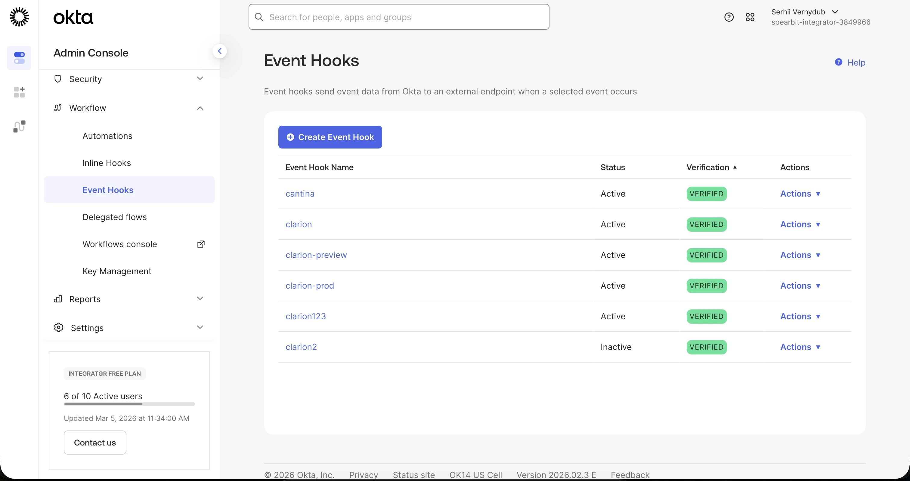 - In Okta, go to Workflow > Event Hooks.