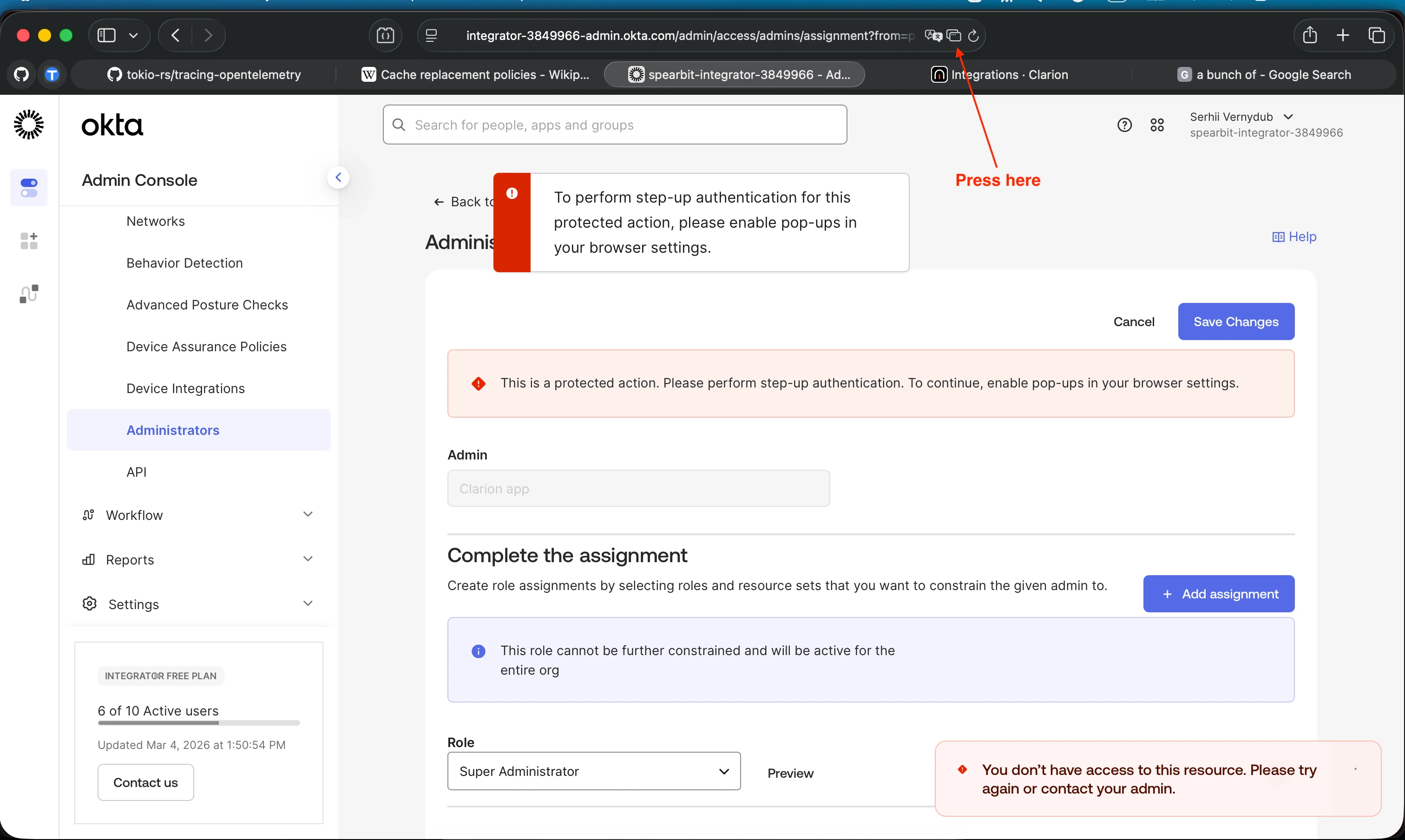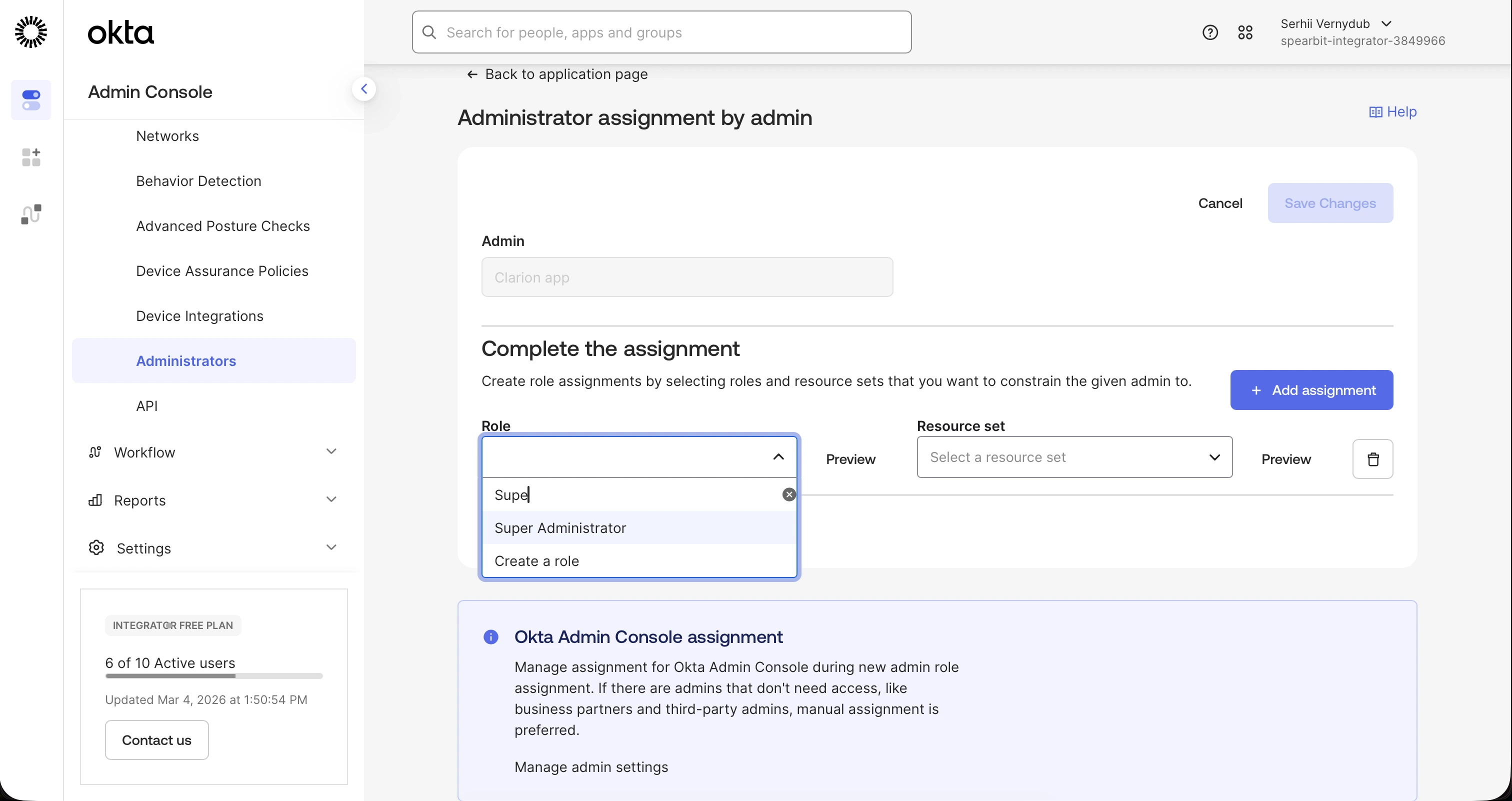 - A Clarion workspace with the Okta integration wizard open